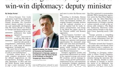 „კორეა-საქართველოს თავისუფალი ვაჭრობის შეთანხმება – გზა ორმხრივი სარგებლის მომტანი დიპლომატიისკენ,” – გენადი არველაძემ სამხრეთ კორეულ „კორეა ჰერალდს” ინტერვიუ მისცა