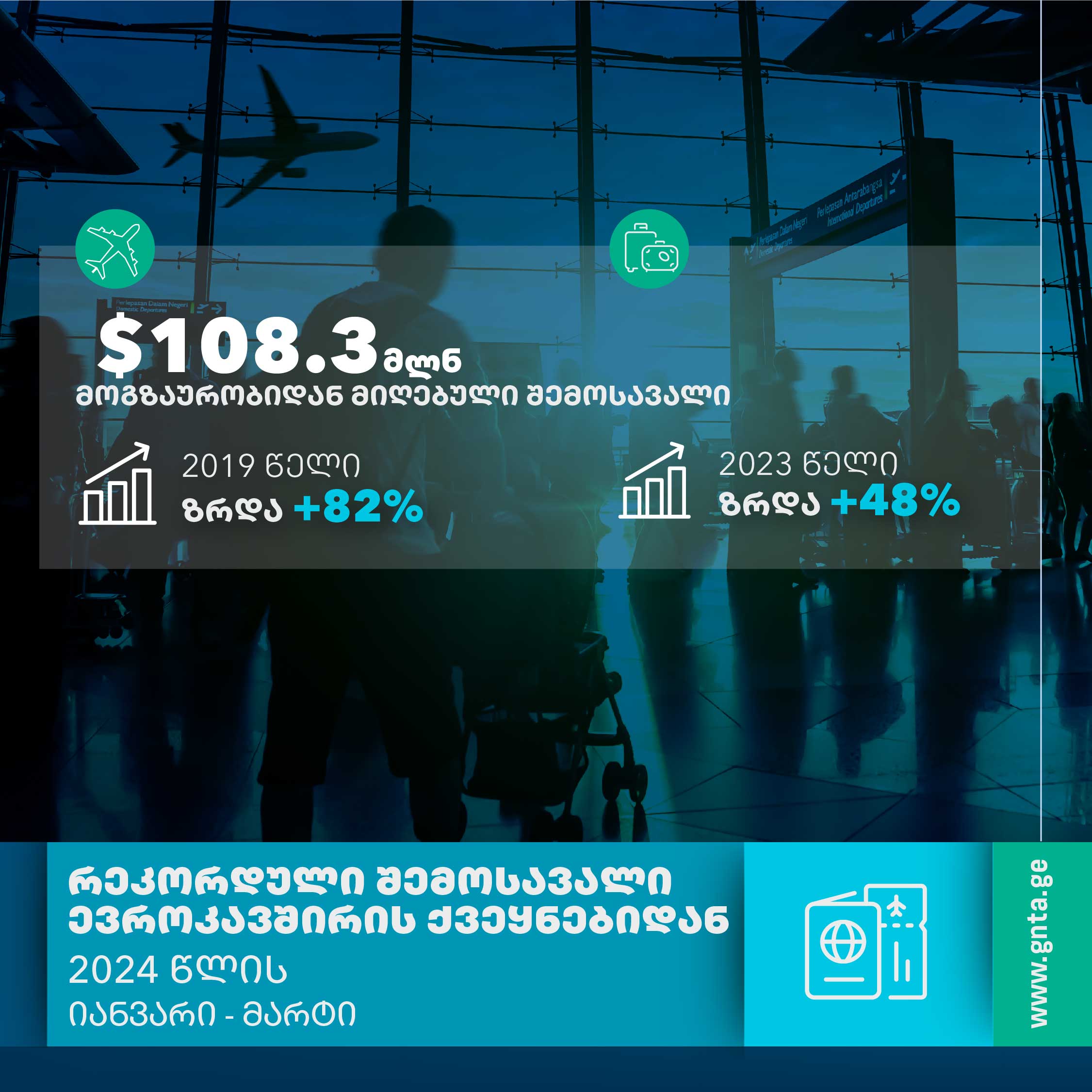 იანვარი-მარტის პერიოდში ევროკავშირის ქვეყნებიდან და დიდი ბრიტანეთიდან საქართველოში 77,045 საერთაშორისო ვიზიტი შედგა. ზრდა 2019 წლის მონაცემებთან შედარებით +44.4%-ია (+23,677 ვიზიტი).
