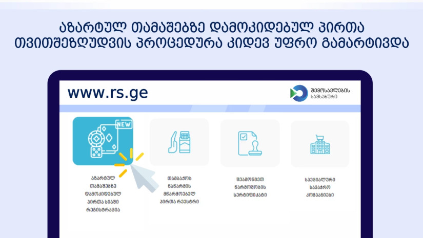 ფინანსთა სამინისტროს შემოსავლების სამსახურის ინფორმაციით, ახალი ელექტრონული სერვისის დანერგვით, აზარტულ თამაშებზე დამოკიდებულ პირთა თვითშეზღუდვის პროცედურა კიდევ უფრო გამარტივდა.