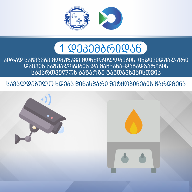 ფინანსთა სამინისტროს შემოსავლების სამსახური შეგახსენებთ, რომ ,,ინდივიდუალური დაცვის საშუალებების შესახებ ტექნიკური რეგლამენტის დამტკიცების თაობაზე ,,საქართველოს მთავრობის 2020 წლის 6 თებერვლის № 82 (https://matsne.gov.ge/ka/document/view/4793418?publication=3 ) , №84 (https://matsne.gov.ge/ka/document/view/4793444?publication=4) და № 85 (https://matsne.gov.ge/ka/document/view/4793455?publication=3) დადგენილებებში შესული ცვლილებების თანახმად, აირად საწვავზე მომუშავე მოწყობილობების, ინდივიდუალური დაცვის საშუალებების და მანქანა-დანადგარების, იმპორტის გზით, საქართველოს ბაზარზე განთავსებისათვის, წინასწარი შეტყობინების წარდგენის ვალდებულება 1 დეკემბრიდან ამოქმედდება.