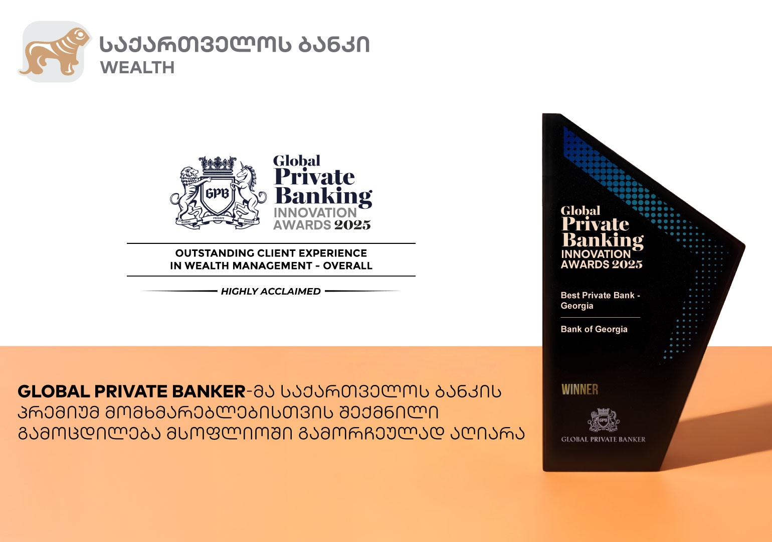 წლევანდელი Global Private Banking Innovation Awards-ის ფარგლებში კი, საქართველოს ბანკის პრემიუმ მომხმარებლებისთვის შექმნილი გამოცდილება მსოფლიოში გამორჩეულად იქნა აღიარებული. ამასთან, საქართველოს ბანკის პრემიუმ მიმართულება საუკეთესოდ დასახელდა საქართველოში.