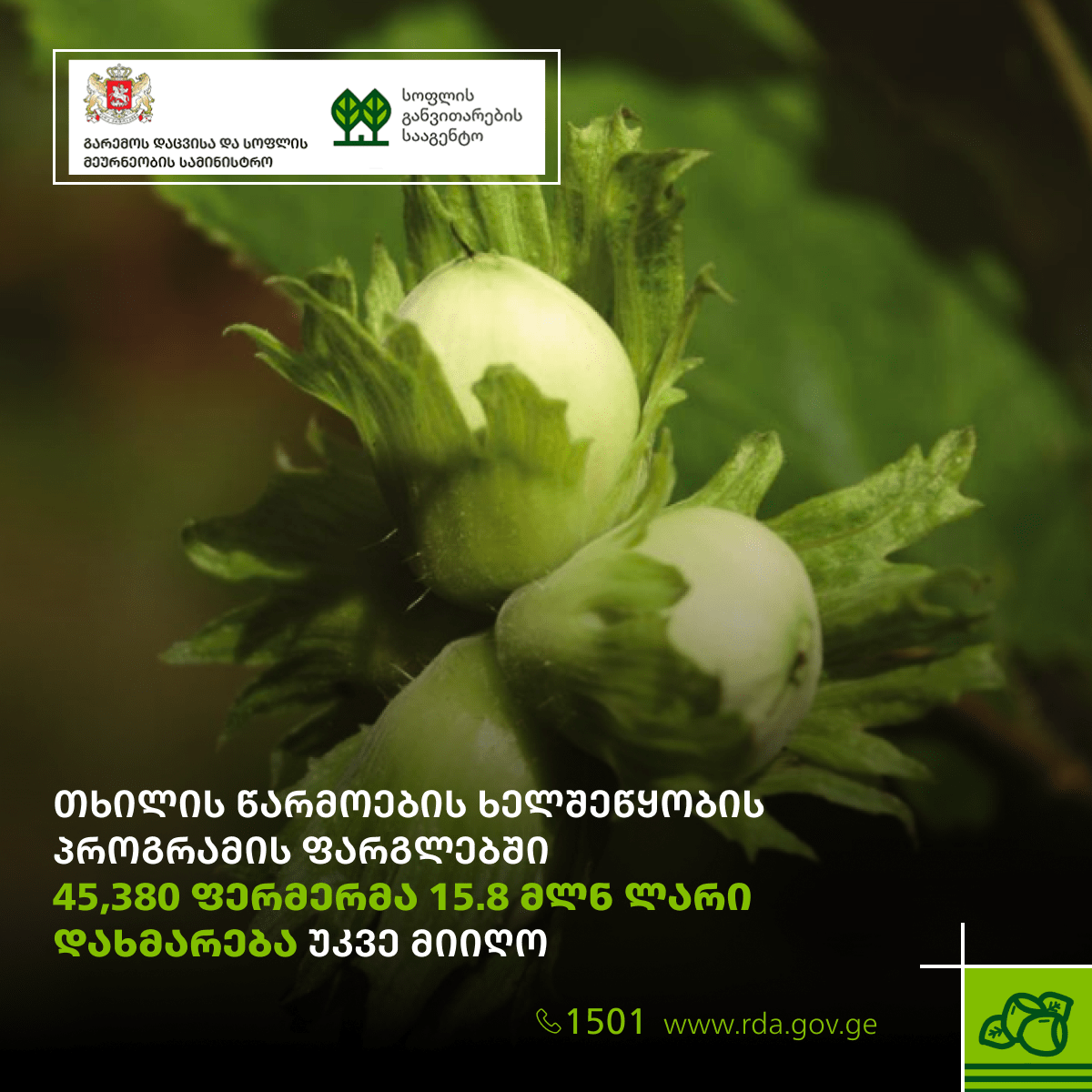 მიმდინარე სეზონზე, 45,380 მეთხილე ფერმერს, 31,673 ჰექტარზე თხილის ბაღებში მავნებლების და დაავადებების საწინააღმდეგოდ ღონისძიებების გასატარებლად, 15.8 მლნ ლარის ღირებულების აგროქულები დაერიცხა. სპეციალიზებულ აგრომაღაზიებში უკვე განაღდებულია 6.2 მლნ ლარზე მეტი.