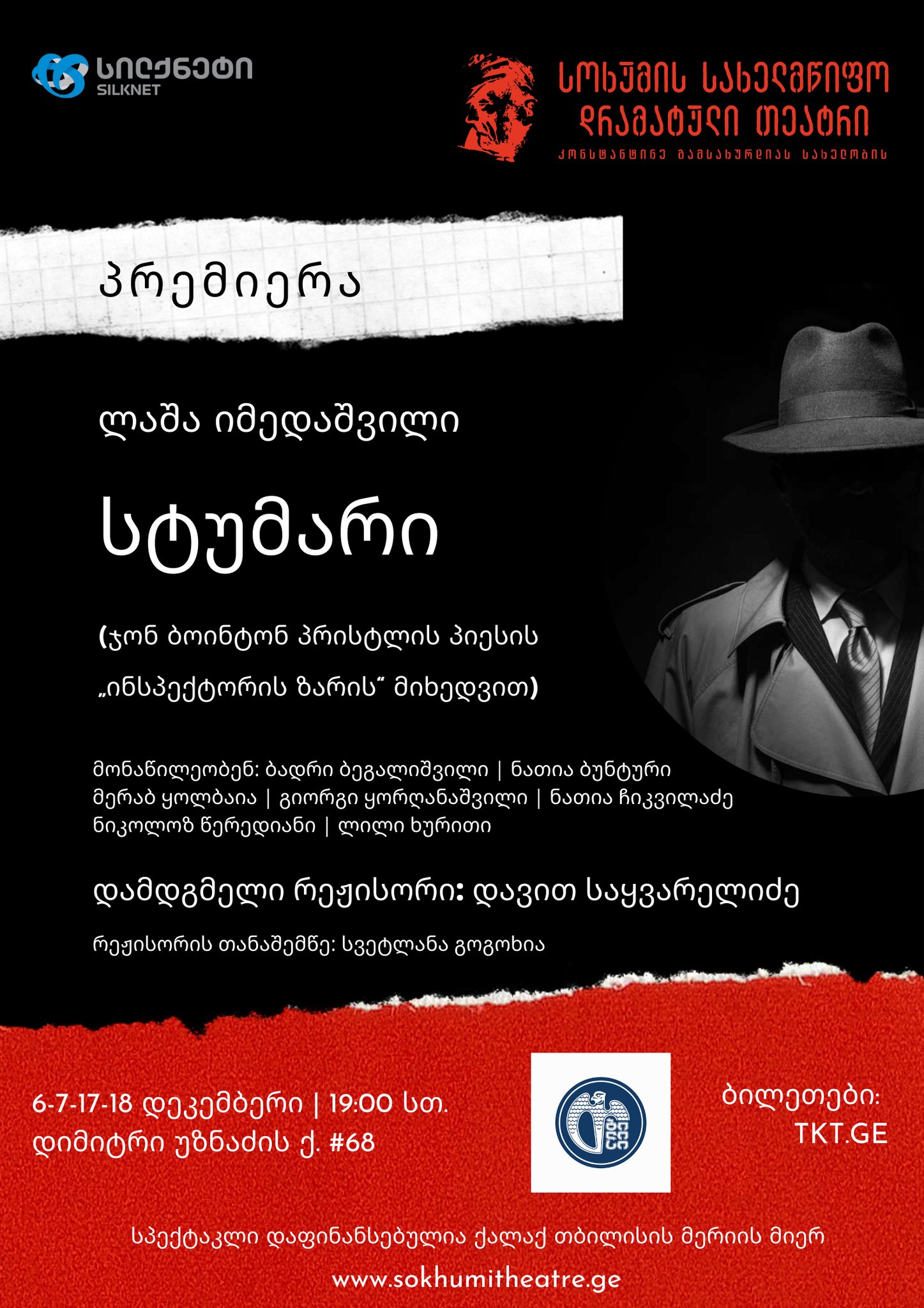 კონსტანტინე გამსახურდიას სახელობის სოხუმის სახელმწიფო დრამატული თეატრი 136-ე სეზონს პრემიერით ხსნის. 6, 7, 17, 18 დეკემბერს სოხუმის თეატრის სცენაზე წარმოდგენილი იქნება სპექტაკლის „სტუმარი“ (ჯონ ბოინტონ პრისტლის პიესის „ინსპექტორის ზარის“ მიხედვით) პრემიერა. პიესის გადმოქართულებული ვერსიის ავტორი: ლაშა იმედაშვილი დამდგმელი რეჟისორი: დავით საყვარელიძე რეჟისორის თანაშემწე: სვეტლანა გოგოხია მონაწილეობენ: ბადრი ბეგალიშვილი, ნათია ბუნტური, მერაბ ყოლბაია, გიორგი ყორღანაშვილი, ნათია ჩიკვილაძე, ნიკოლოზ წერედიანი, ლილი ხურითი ხანგრძლივობა: 90 წუთი (შესვენების გარეშე) ჟანრი: