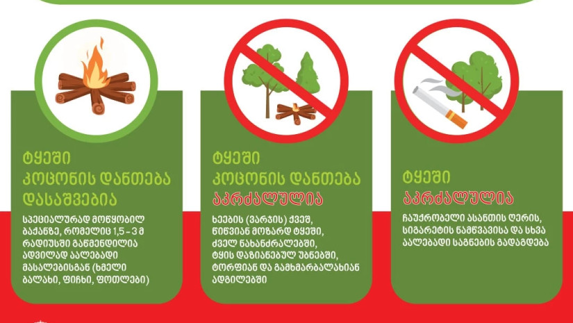 შეგახსენებთ, რომ ტყის ტერიტორიაზე კოცონის დანთება აკრძალულია ხეების ვარჯის ქვეშ, წიწვიან მოზარდ ტყეში, ძველ ნახანძრალებში, ტყის დაზიანებულ უბნებში (ტყის ქარქცეულ ან ქარტეხილ ადგილებში), დამზადების ნარჩენებიდან გაუწმენდავ ტყეკაფებში, გამოუზიდავად დატოვებული დამზადებული მერქნის ადგილებში, ტორფიან და გამხმარბალახიან ადგილებში.