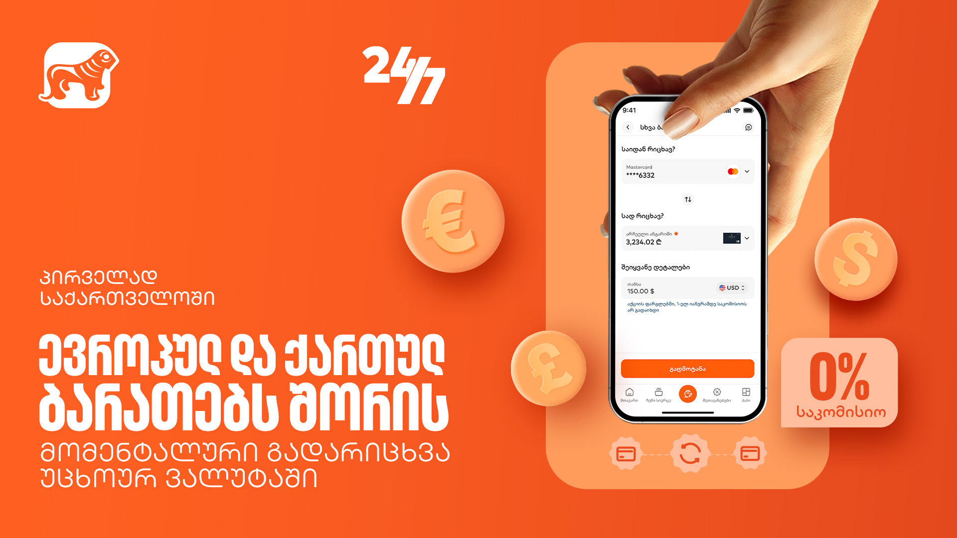 განახლებული ფუნქციონალით უკვე შესაძლებელია ევროპულ და ქართულ ბარათებს შორის თანხის მომენტალურად გადარიცხვა უცხოურ ვალუტაში, ამასთან: