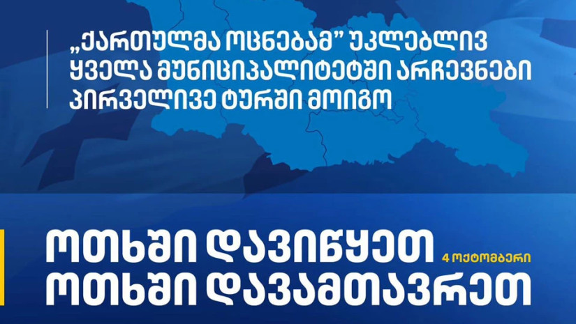 „ქართულმა ოცნებამ“ უკლებლივ ყველა მუნიციპალიტეტში არჩევნები პირველივე ტურში მოიგო. ოთხში დავიწყეთ, ოთხში დავამთავრეთ“, – წერია ბანერზე, რომელიც პარტიის ფეისბუკგვერდზე გამოქვეყნდა.