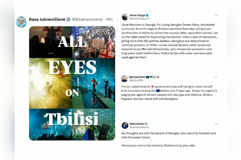 ხელისუფლების დამხობის მოთხოვნით მიმდინარე აქციას მხარდაჭერა გამოუცხადა ლიეტუვის პარლამენტის წევრმა და თავდაცვის ყოფილმა მინისტრმა ლაურინას კაშჩუნასმა, რომელმაც X-ზე დაწერა: “სამშობლოს კავშირი – ლიეტუველი ქრისტიან-დემოკრატები” დღეს ქართველებს უდგანან გვერდში – სანამ რუსული გავლენისგან არ გათავისუფლდებით და ევროკავშირისა და ნატოს ნაწილი არ იქნებით”.