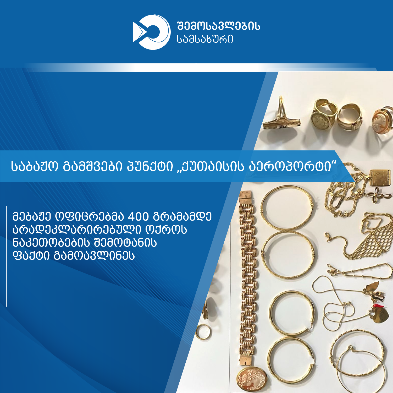 01 – 15 ოქტომბერს, ფინანსთა სამინისტროს შემოსავლების სამსახურის საბაჟო გამშვებ პუნქტში ,,ქუთაისის აეროპორტი”, კანონდარღვევის 4 ფაქტი აღიკვეთა. კერძოდ, მებაჟე ოფიცრებმა ეჭვის საფუძველზე, საქართველოს მოქალაქეების, როგორც ფიზიკური, ასევე კუთვნილი ბარგის დეტალური დათვალიერების შედეგად, ჯამში 400 გრამამდე არადეკლარირებული ოქროს საიუველირო ნაკეთობები და მონეტები აღმოაჩინეს.
