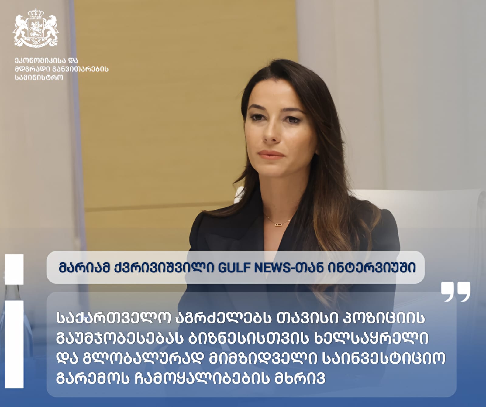 „საქართველოს ეკონომიკამ შთამბეჭდავი მდგრადობა აჩვენა. 2024 წელს ეკონომიკურმა ზრდამ 9,4% შეადგინა. პანდემიის შემდგომ პერიოდში, საქართველო რეგიონსა და ევროპაში ერთ-ერთი საუკეთესო შედეგების მქონე ქვეყნად იქცა და 2021-2024 წლებში საშუალოდ ზრდამ 9,7%-ს მიაღწია. 2025 წელიც მნიშვნელოვანი ეკონომიკური აქტივობით დაიწყო: იანვარ-აგვისტოში 7,9%-იანი ეკონომიკური ზრდა დაფიქსირდა,” – განაცხადა ეკონომიკისა და მდგრადი განვითარების მინისტრმა მარიამ ქვრივიშვილმა არაბთა გაერთიანებული საამიროების გამოცემა Gulf News – სთან ინტერვიუში.