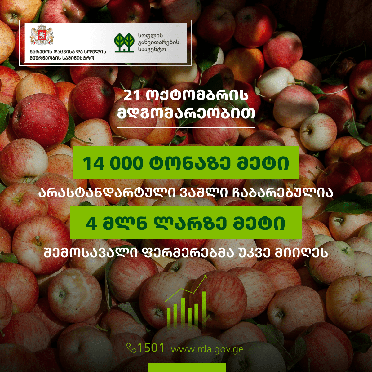 „არასტანდარტული ვაშლის რეალიზაციის ხელშეწყობის“სახელმწიფო პროგრამა მიმდინარე წლის 9 სექტემბრიდან ვაშლის მოსავლის დაბინავების პროცესში ფერმერთა ხელშეწყობის მიზნით ამოქმედდა.