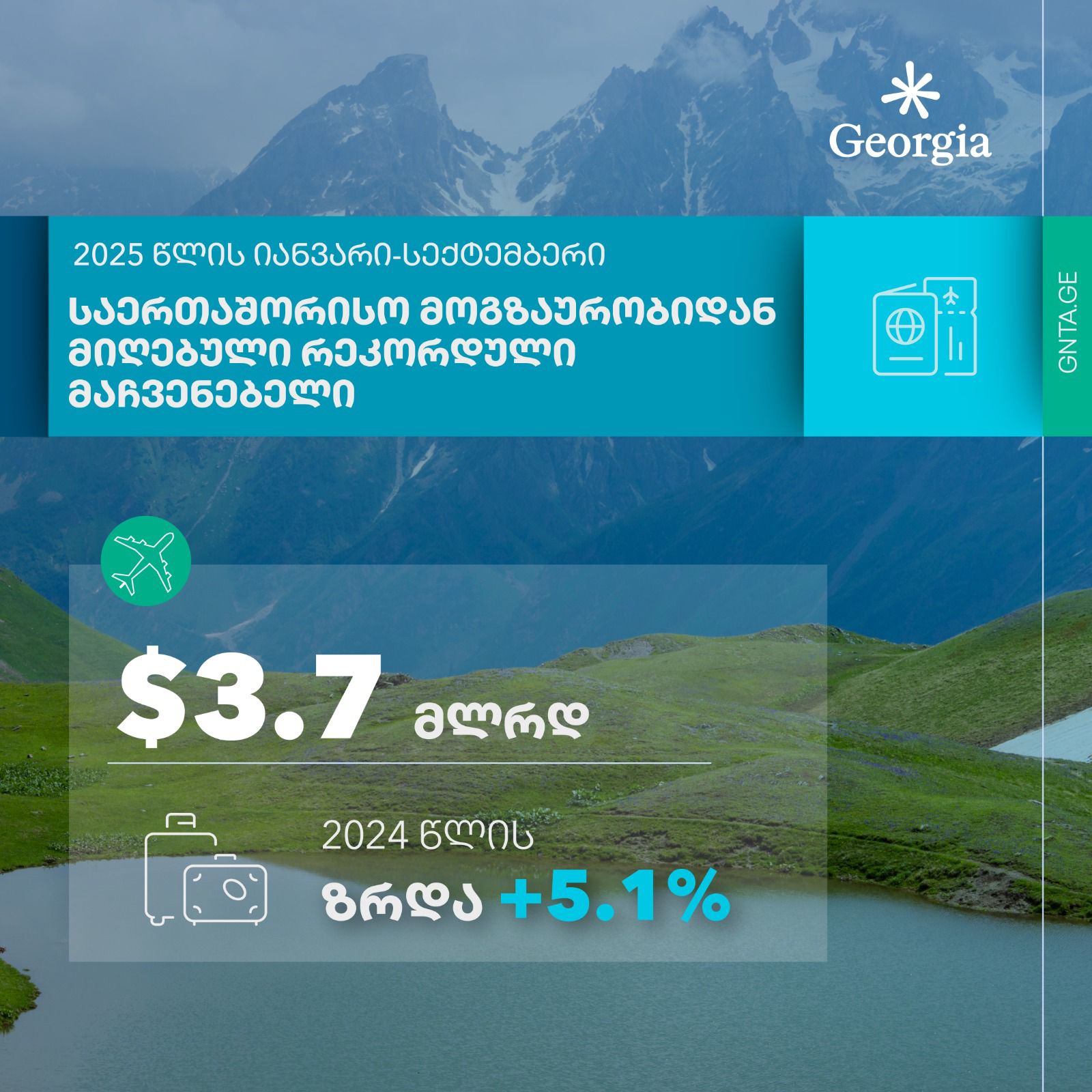2025 წლის III კვარტალში საქართველომ მოგზაურობიდან 1,666.8 მილიონი აშშ დოლარის შემოსავალი მიიღო, რაც წინა წლის ანალოგიურ პერიოდთან შედარებით, 6.6%-ით მეტია. ხოლო ჯამურად, მიმდინარე წლის სამ კვარტალში აღნიშნულმა მაჩვენებელმა 3,637.8 მილიონი აშშ დოლარი შეადგინა (წლიური ზრდა 5.1%).