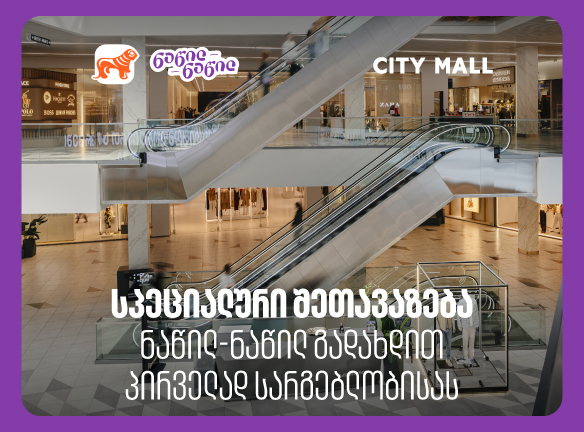 მხოლოდ29 ოქტომბერს,თუ პირველად ისარგებლებთ საქართველოს ბანკის ნაწილ-ნაწილ გადახდით, სითი მოლში შოპინგისას 30%-იან ქეშბექს მიიღებთ (მაქსიმუმ 100 ₾).