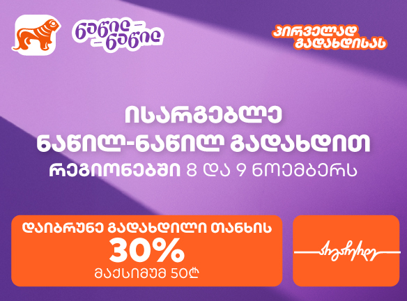 მხოლოდ 8 და 9 ნოემბერს, ის მომხმარებლები, რომლებიც პირველად ისარგებლებენ საქართველოს ბანკის ნაწილ-ნაწილ გადახდით, 30%-იან ქეშბექსმიიღებენ (მაქსიმუმ 50 ლარს).შეთავაზება ვრცელდებასაქართველოს ბანკის ყველა იმ პარტნიორ მაღაზიაში, სადაც ნაწილ-ნაწილით გადახდახელმისაწვდომია.
