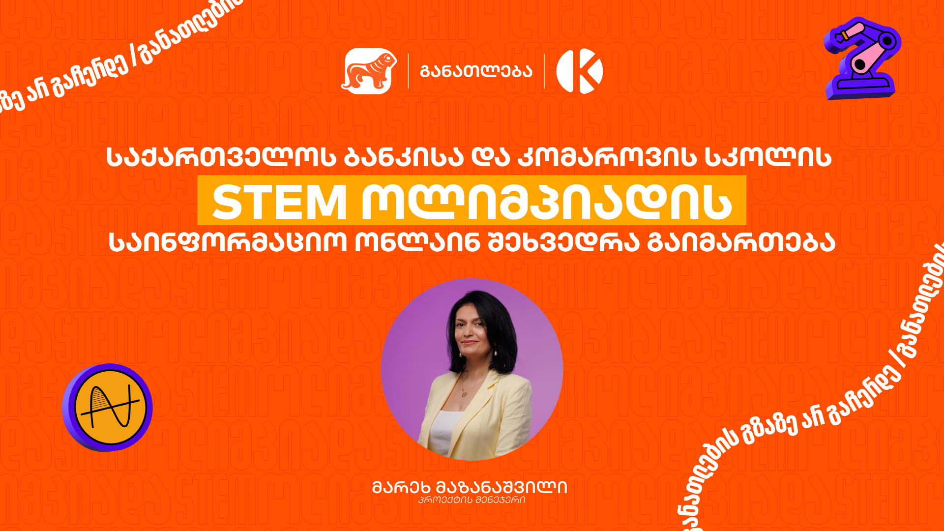 ინფორმაციისთვის საქართველოს ბანკისა და კომაროვის სკოლის STEM ოლიმპიადაზე რეგისტრაცია 30 ნოემბრის ჩათვლით გრძელდება. დარეგისტრირდი და გამოავლინე შენი ცოდნა ფიზიკისა და მათემატიკის მიმართულებით და გაიმარჯვე.