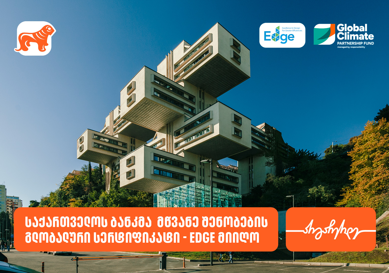 საქართველოს ბანკი, ქვეყნის წამყვანი ფინანსური ინსტიტუტი, გარემოსდაცვითი სტანდარტების დანერგვას აგრძელებს. ბანკის სათავო ოფისმა, რომელიც ქართული არქიტექტურის უნიკალური ძეგლია, მწვანე შენობის EDGE (Excellence in Design for Greater Efficiencies)-ის პრესტიჟული საერთაშორისო სერტიფიკატი მოიპოვა. პროექტი ბანკის ერთ-ერთი მნიშვნელოვანი პარტნიორი საერთაშორისო ფინანსური ინსტიტუტის- გლობალური კლიმატის პარტნიორობის ფონდის (GCPF) ფინანსური მხარდაჭერით განხორციელდა.