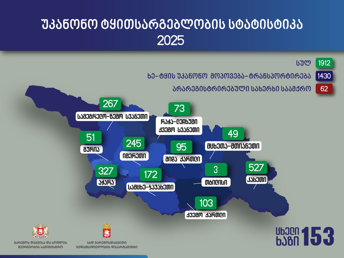 2025 წლის 01 იანვრიდან 31 დეკემბრის ჩათვლით, გამოვლენილი უკანონო ტყითსარგებლობის 1912 ფაქტიდან 1430 ხე-ტყის უკანონო მოპოვება-ტრანსპორტირებას ეხება, 482 კი, სახერხი საამქროების მიერ ტექნიკური რეგლამენტის დარღვევისა და უკანონო სახერხი საამქროების ფაქტებია. სამართალდარღვევებიდან 169 ფაქტი შეიცავს სისხლის სამართლის დანაშაულის ნიშნებს და მასალები, შემდგომი რეაგირების მიზნით, შესაბამის უწყებებში გადაიგზავნა.