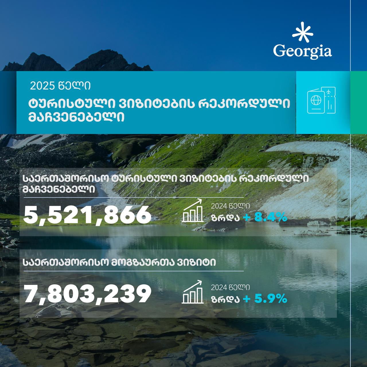 საქართველოში 2025 წელს ტურისტული ვიზიტების რეკორდული მაჩვენებელი დაფიქსირდა და ისტორიულ მაქსიმუმს 5,521,866 ვიზიტს მიაღწია, ზრდა 2024 წელთან შედარებით +8.4%-ით მეტია.