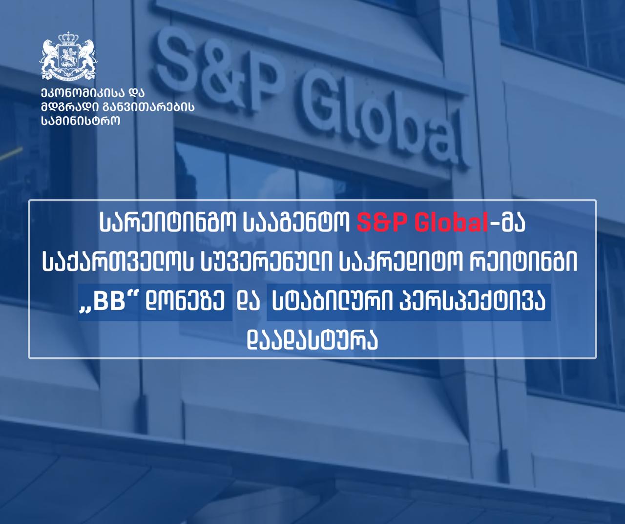 სარეიტინგო სააგენტო S&P Global-მა საქართველოს სუვერენული საკრედიტო რეიტინგი „BB” დონეზე სტაბილური პერსპექტივით უცვლელი დატოვა.