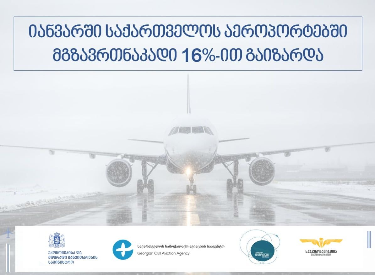 2026 წლის იანვარში საქართველოს აეროპორტებში მგზავრთნაკადი 16%-ით გაიზარდა. ამავე პერიოდში ქვეყნის აეროპორტებში შესრულებულმა ავიარეისების ჯამურმა მაჩვენებელმა 2873 შეადგინა, რავ გასული წლის იანვრის მონაცემს 16.17%-ით აღემატება. ხაზგასასმელია 2026 წლის იანვარში გადაზიდული ტვირთების მოცულობაც, რომლის ზრდამ 2025 წლის ანალოგიურ პერიოდთან შედარებით, 38 %-ს გადააჭარბა.
