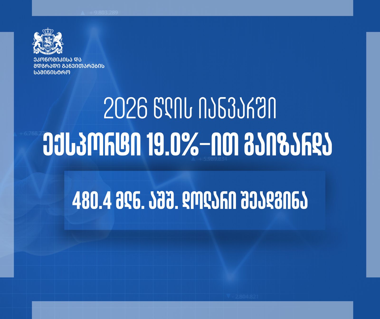2026 წლის იანვარში ექსპორტი, წინა წლის ანალოგიურ პერიოდთან შედარებით, 19%-ით გაიზარდა და 480.4 მლნ. აშშ დოლარი შეადგინა.