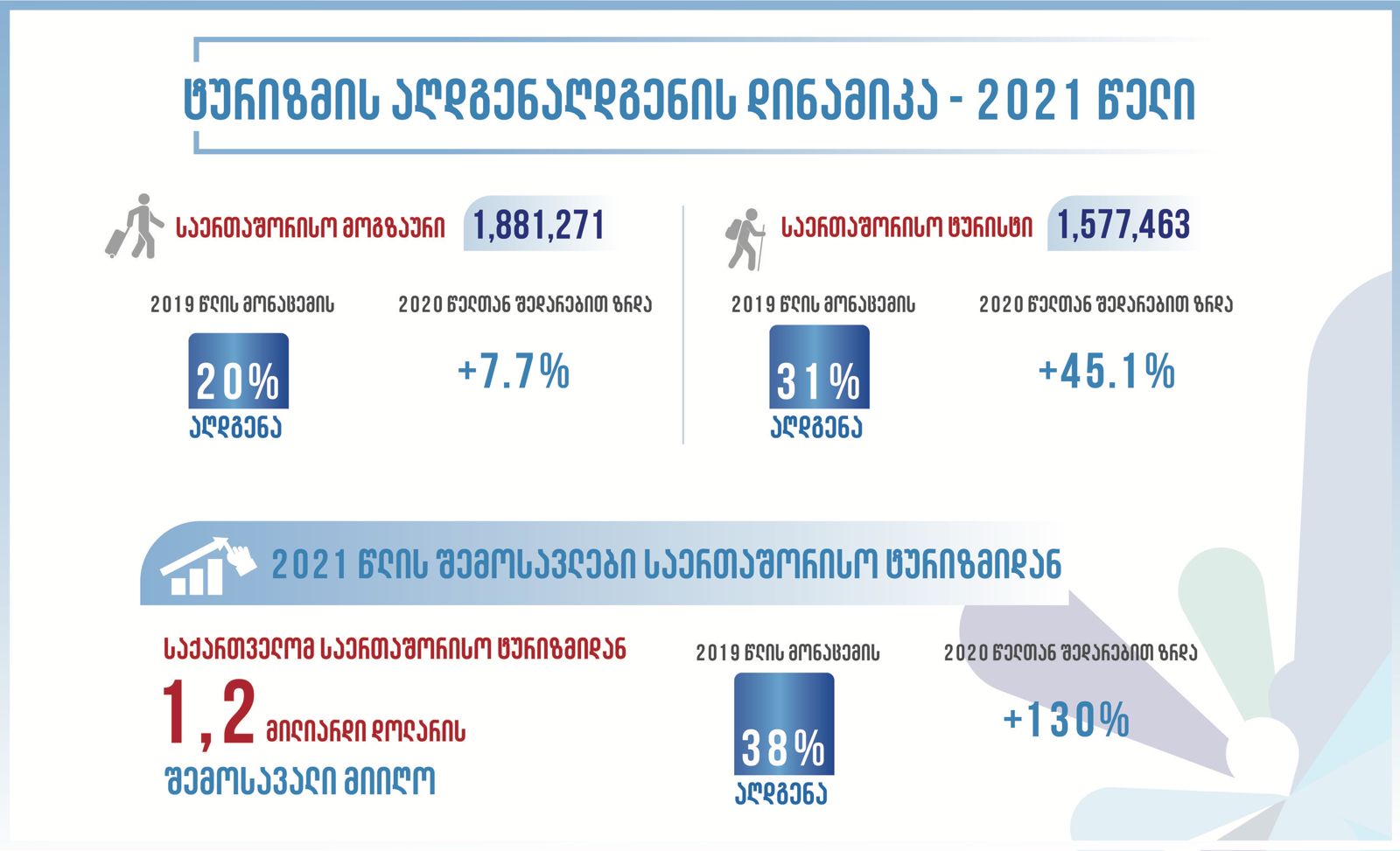 2021 წლის 12 თვეში საქართველოში 1,577,463 საერთაშორისო ტურისტული ვიზიტი შედგა. 2019 წლის მონაცემთან შედარებით ტურისტული ვიზიტების 31%-ი აღდგენილია. 2020 წელთან შედარებით კი ზრდა 45.1%-ს შეადგენს.