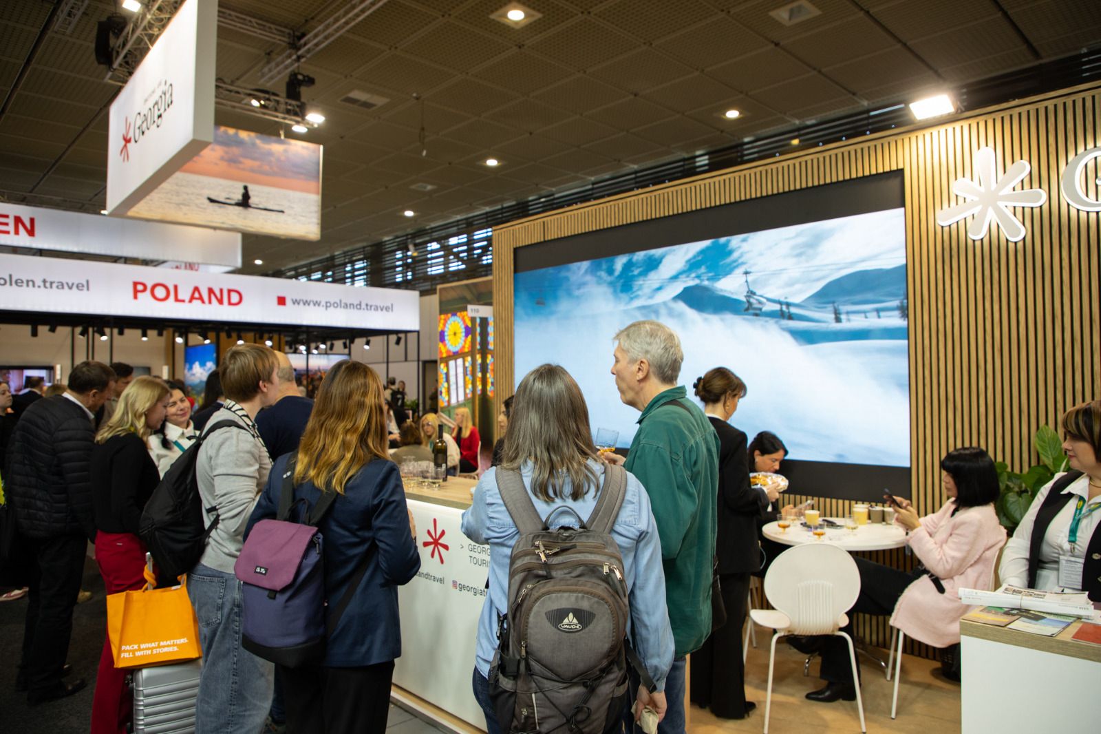 გამოფენის სტუმრები საქართველოს სტენდთან ადგილობრივი ტურისტული პროდუქტებს, კურორტებსა და ღირსშესანიშნაობებს ეცნობიან, პარალელურად, კომპანიებს შესაძლებლობა აქვთ პოტენციურ პარტნიორებთან საქმიანი კონტაქტები დაამყარონ.