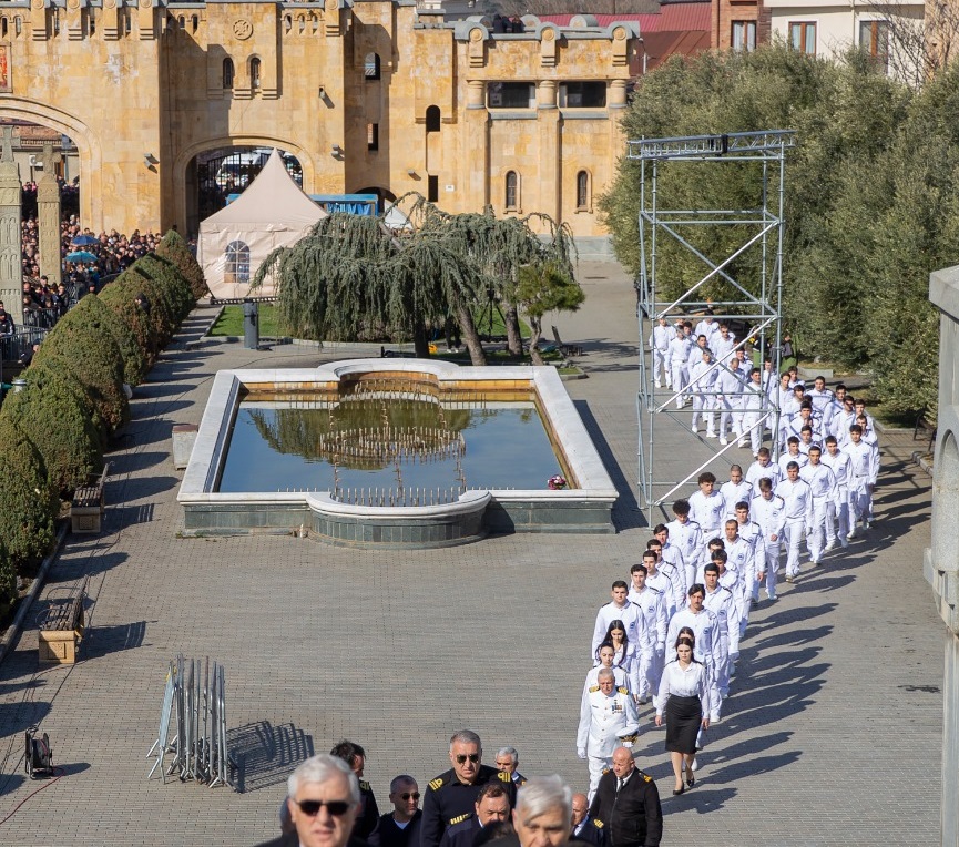 სამების საკათედრო ტაძარში პატრიარქის სამოქალაქო პანაშვიდზე საზღვაო აკადემიის სტუდენტები, რექტორი და საზღვაო ტრანსპორტის სააგენტოს ხელმძღვანელი პირები ეკონომიკისა და მდგრადი განვითარების მინისტრ მარიამ ქვრივიშვილთან და მინისტრის მოადგილეებთან ერთად იმყოფებოდნენ.