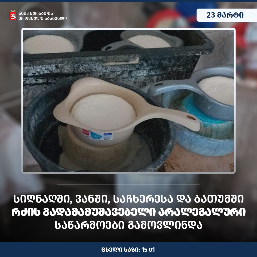 სააგენტოს კახეთის, იმერეთისა და აჭარის დეპარტამენტის ინსპექტორებმა, ჩატარებული მოკვლევის საფუძველზე, სიღნაღში, ვანში, საჩხერესა და ბათუმში რძის გადამმუშავებელი არალეგალური საწარმოები გამოავლინეს.