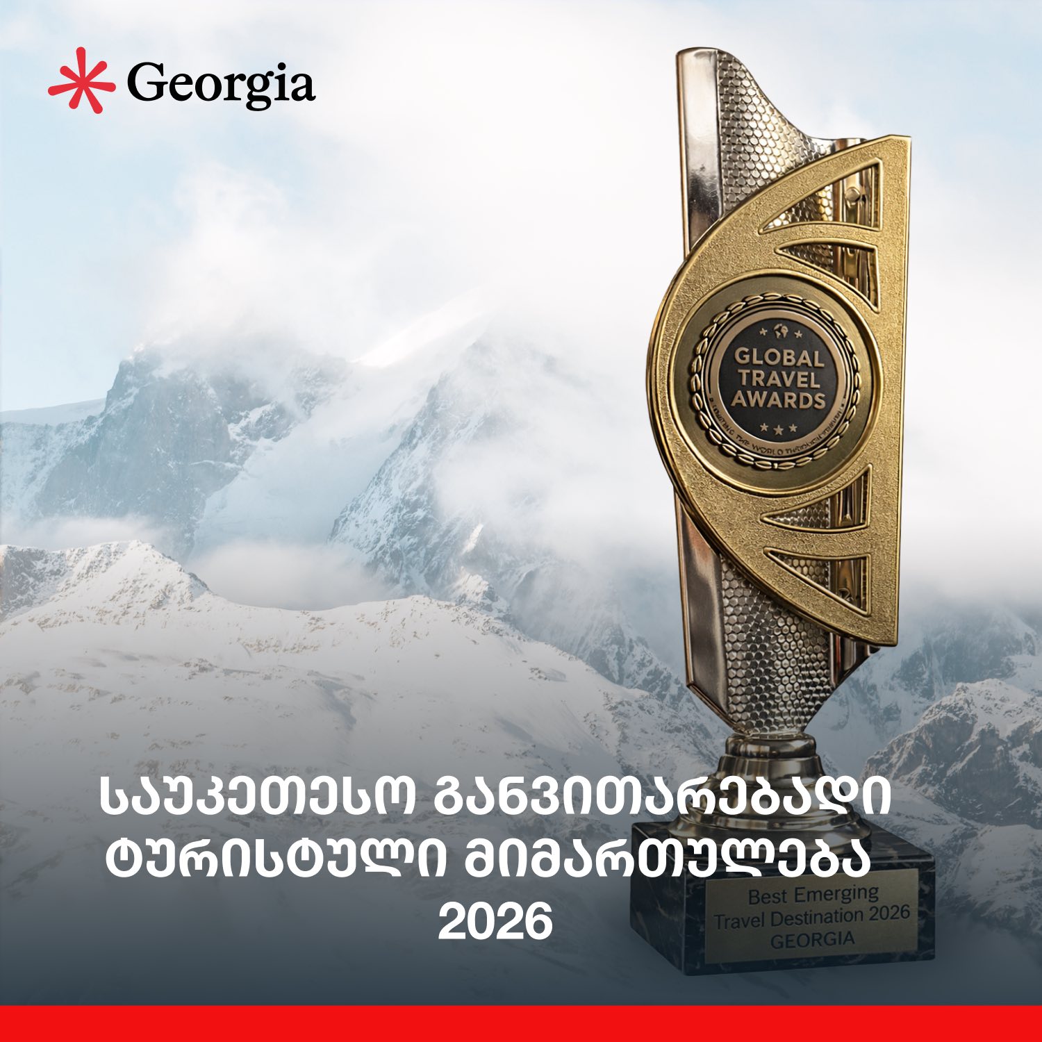 საერთაშორისო ტურისტულ პლატფორმაზე Global Travel Awards საქართველომ 2026 წლის საუკეთესო განვითარებადი ტურისტული მიმართულების „Best Emerging Travel Destination“ კატეგორიაში გამარჯვება მოიპოვა.