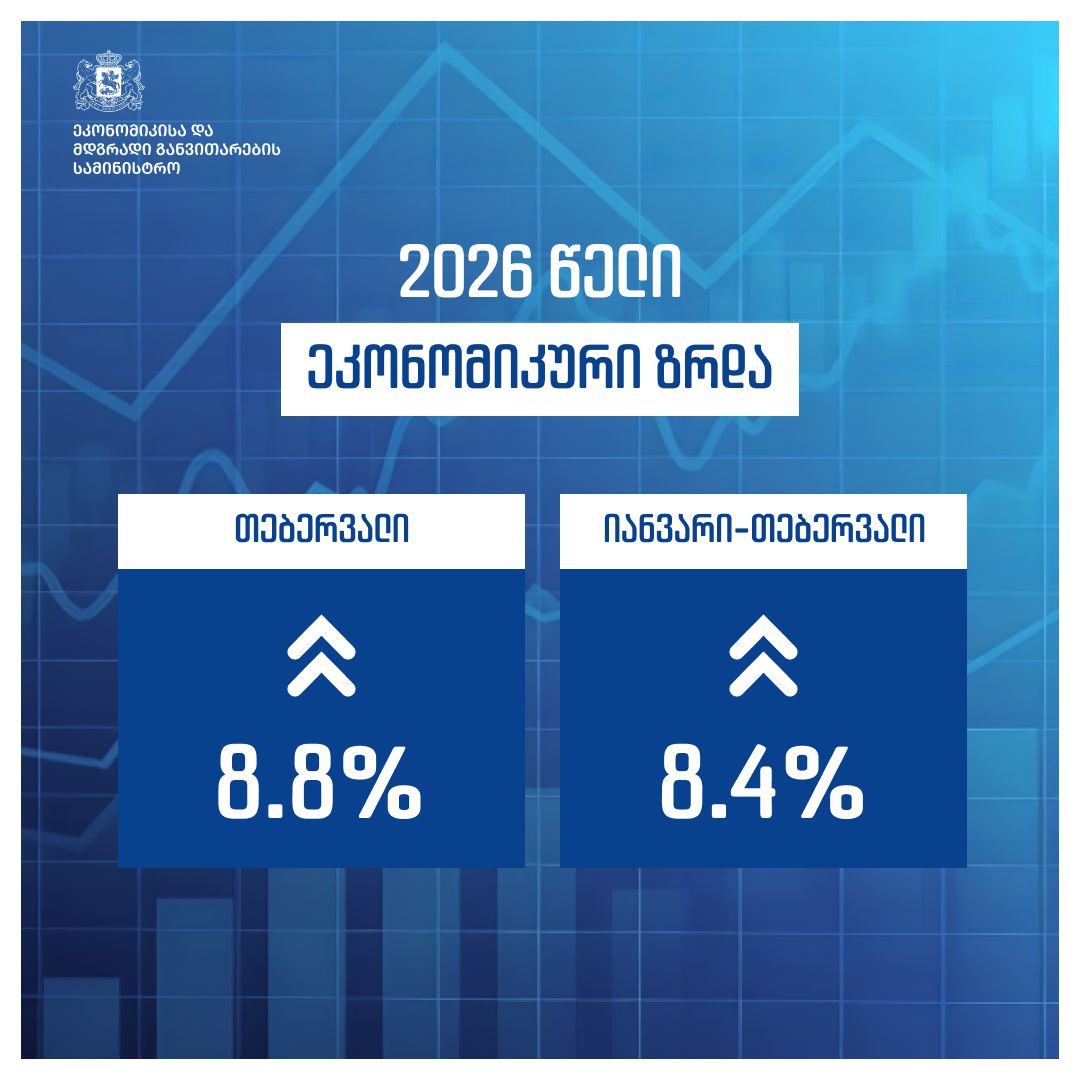 2026 წლის თებერვალში საქართველოს ეკონომიკა 8,8%-ით გაიზარდა, ხოლო იანვარ-თებერვლის საშუალო ეკონომიკური ზრდა 8.4%-ს გაუტოლდა.