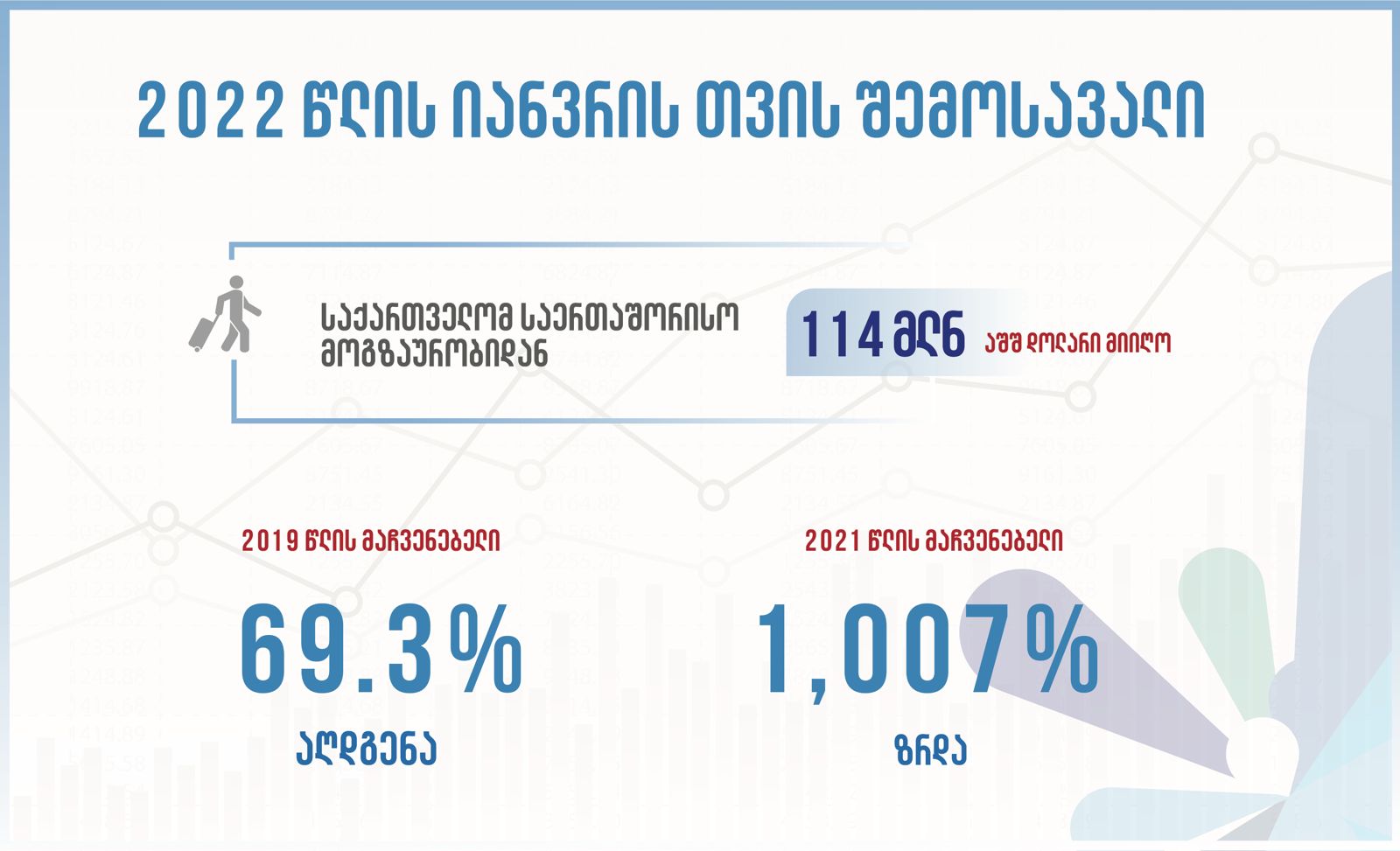 მიმდინარე წლის იანვარში საერთაშორისო მოგზაურობიდან საქართველომ 114,022,899 აშშ დოლარის შემოსავალი მიიღო, რაც 2019 წლის მაჩვენებლის 69.3% აღდგენაა. 2021 წლის იანვრის თვესთან შედარებით საერთაშორისო მოგზაურობიდან შემოსავლები გაზრდილია 103,663,879 (+1,007%) აშშ დოლარით.