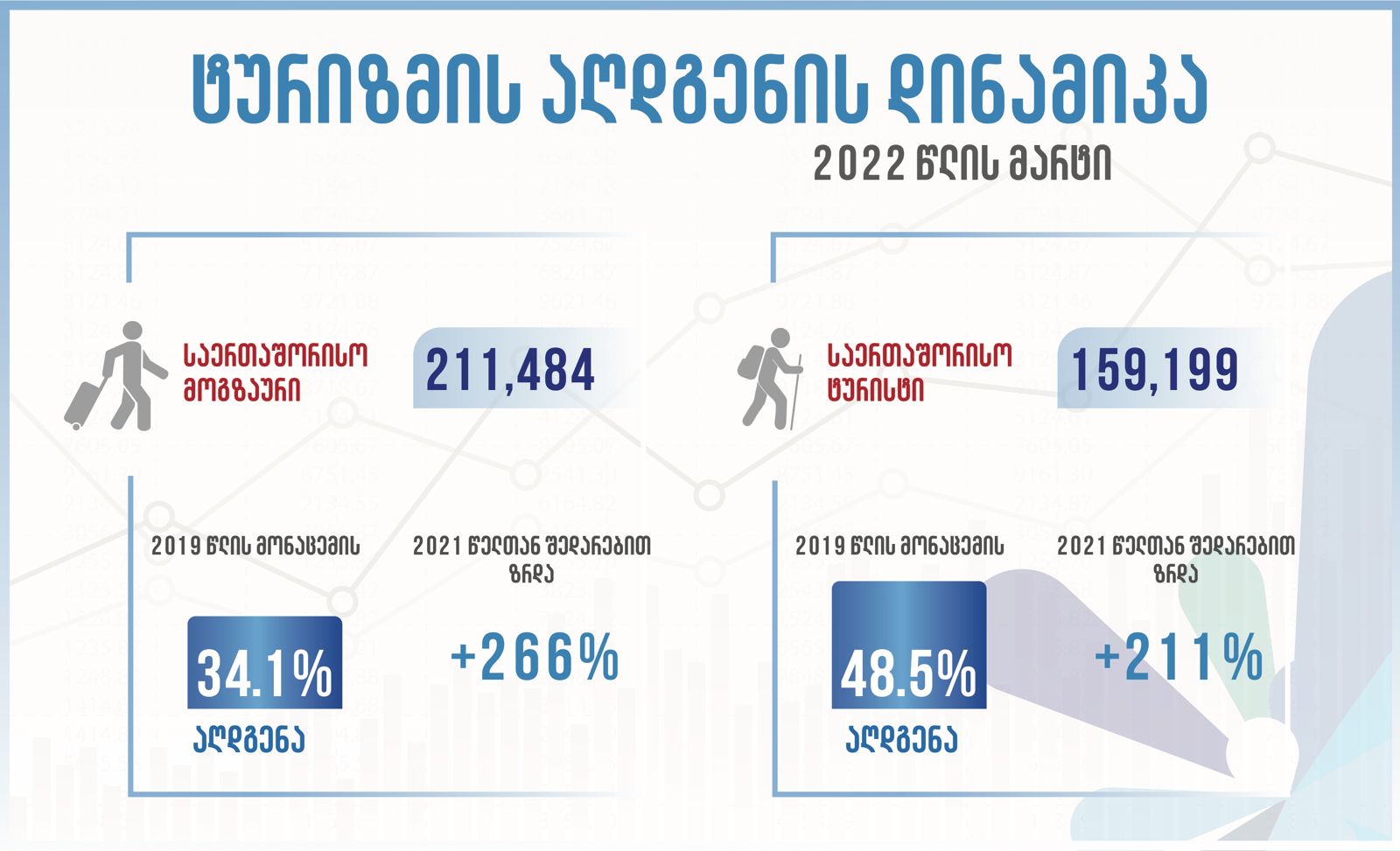 ტურიზმის ეროვნული ადმინისტრაცია მარტის თვის სტატისტიკურ მონაცემებს აქვეყნებს. 2022 წლის მარტის თვეში საქართველოში 211,484 საერთაშორისო მოგზაურების ვიზიტი განხორციელდა, ზრდა წინა წლის ანალოგიურ პერიოდთან შედარებით +266.3%, საერთაშორისო მოგზაურების აღდგენის კოეფიციენტი 2019 წლის მონაცემებთან 34.1%-ია. საერთაშორისო ვიზიტორების მიერ განხორციელებულმა ვიზიტების რაოდენობამ 188,354 შეადგინა, 2021 წლის ანალოგიურ პერიოდთან შედარებით ზრდა +236.9%-ია, ხოლო 2019 წლის ანალოგიური პერიოდის აღდგენაკი 37.1%-ია. ტურისტული ვიზიტების რაოდენობამ 159,199 შეადგინა, რაც +107,944-ით მეტია 2021 წლის მარტის მაჩვენებელზე (ზრდა +210.6%), 2019 წლის მარტისთვის აღდგენა კი 48.5%-ია.