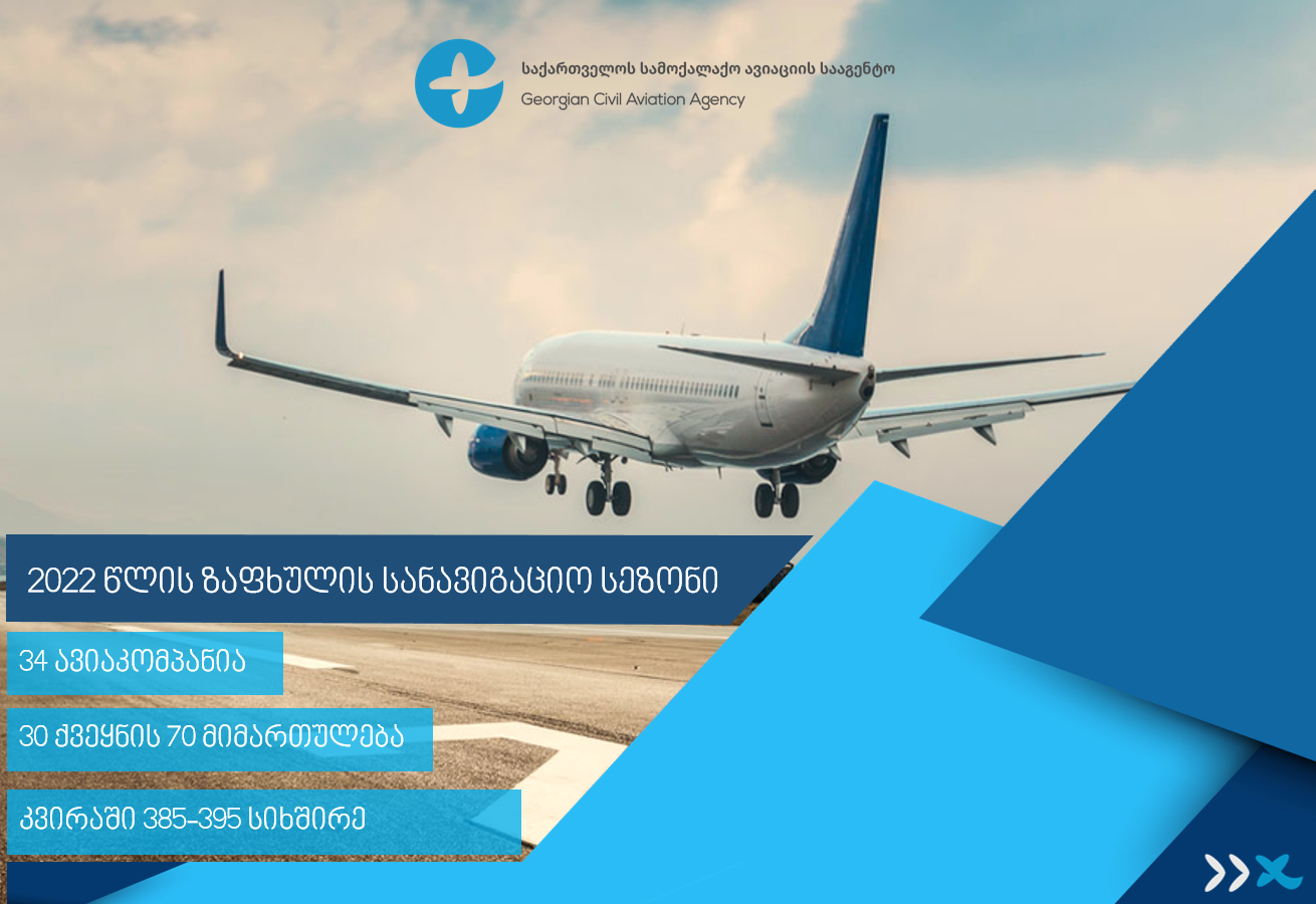 საქართველოს ეკონომიკისა და მდგრადი განვითარების სამინისტროს სსიპ სამოქალაქო ავიაციის სააგენტომ დაამტკიცა 2022 წლის ზაფხულის სანავიგაციო სეზონის ფრენის განრიგი. ამასთან, სააგენტო აგრძელებს ავიაკომპანიების განაცხადების მიღებას დამატებითი რეგულარული და სეზონური მრავალჯერადი ჩარტერული რეისების შესასრულებლად. ამ ეტაპისთვის წარმოდგენილი განაცხადების მიხედვით, ფრენები შესრულდება 34 ავიაკომპანიის მიერ, 30 ქვეყნის 70 მიმართულებით. არსებული მონაცემებით, რეისები კვირაში 385-395 სიხშირით განხორციელდება, თუმცა სეზონის პიკურ პერიოდში ფრენების რაოდენობა უფრო მზარდი იქნება.