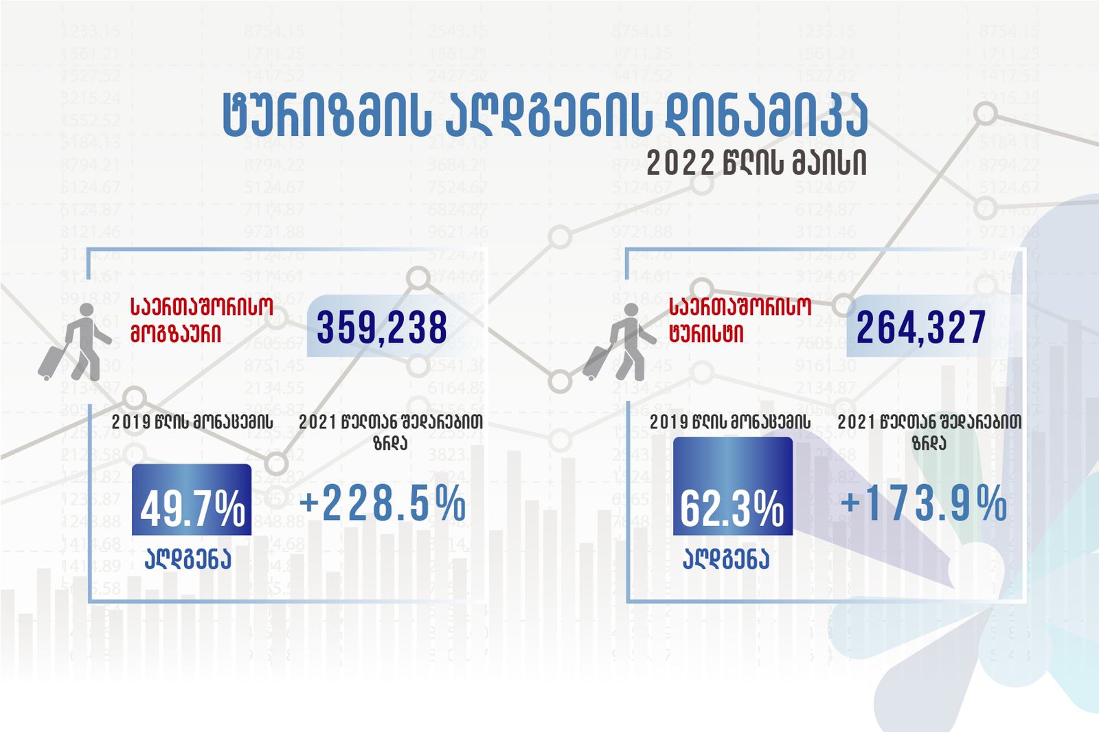 მაისში საერთაშორისო ტურისტული ვიზიტების რაოდენობამ 264,327 შეადგინა, რაც +173.9%-ით მეტია გასული წლის ანალოგიურ პერიოდთან შედარებით, ხოლო 2019 წლის აპრილის თვის მონაცემებთან შედარებით ტურისტული ვიზიტები 62.3%-ით არის აღდგენილი.