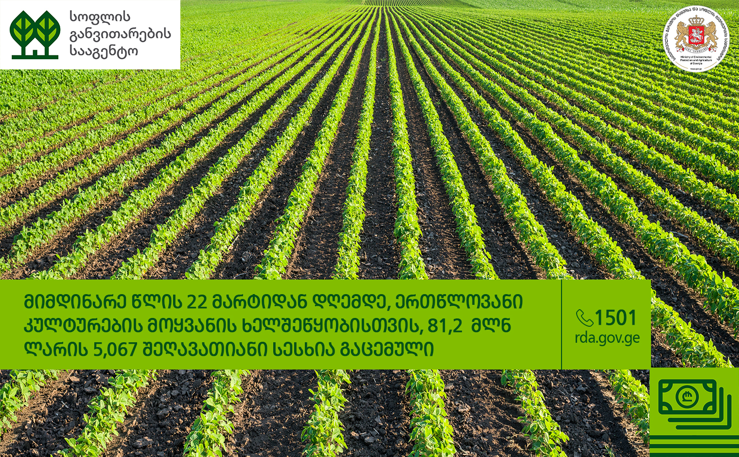 მიმდინარე წლის 22 მარტიდან დღემდე, ერთწლოვანი კულტურების მოყვანის ხელშეწყობისთვის 81,2 მლნ ლარის 5,067 შეღავათიანი სესხია გაცემული.