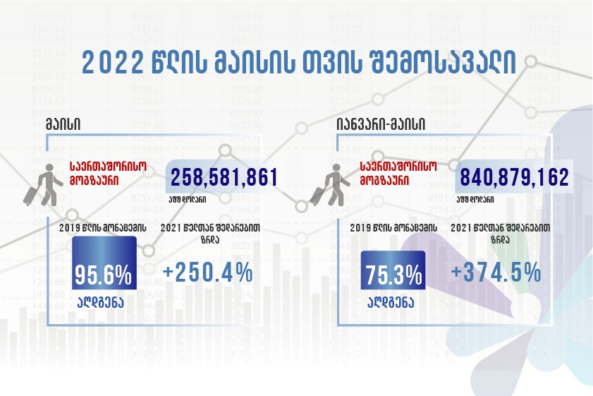 იანვარი-მაისის თვეში საერთაშორისო მოგზაურობიდან მიღებულმა შემოსავალმა 840,879,162 აშშ. დოლარი შეადგინა, რაც 2019 წლის მაჩვენებლის 75.3% აღდგენაა. 2021 წლის იანვრი-მაისის თვესთან შედარებით მოგზაურობიდან შემოსავლები 663,668,204 (+374.5%) აშშ დოლარით გაიზარდა.