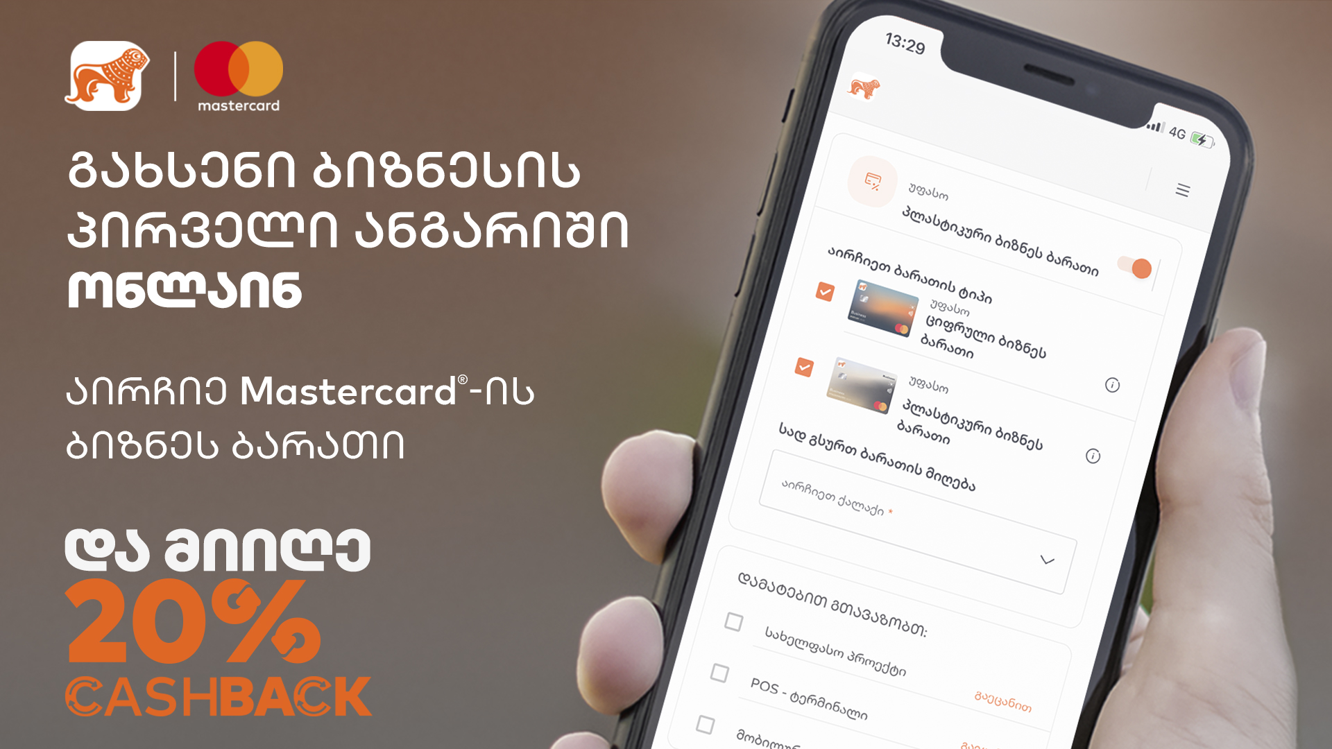 საქართველოს ბანკი განაგრძობს მცირე და საშუალო ბიზნესის გაძლირებისთვის მათზე მორგებული ახალი შესაძლებლობების შექმნას. ამჯერად ბანკმა ბიზნეს მომხმარებელს ქეშბექი შესთავაზა.მომხმარებელი, რომელიცონლაინ გახსნის ანგარიშს https://bit.ly/39xB4Od-დან, რეგისტრაციის დღიდან, პირველი ორი თვის განმავლობაში, Mastercard ბიზნესბარათით (იქნება ეს პლასტიკური თუ ციფრული) ეროვნულ ვალუტაში შესრულებულ ტრანზაქციებზე Cashback-ის სახით მიიღებს გადახდილი თანხის 20%-ს,მაქსიმუმ 400 ლარს, თითოეულ თვეზე.
