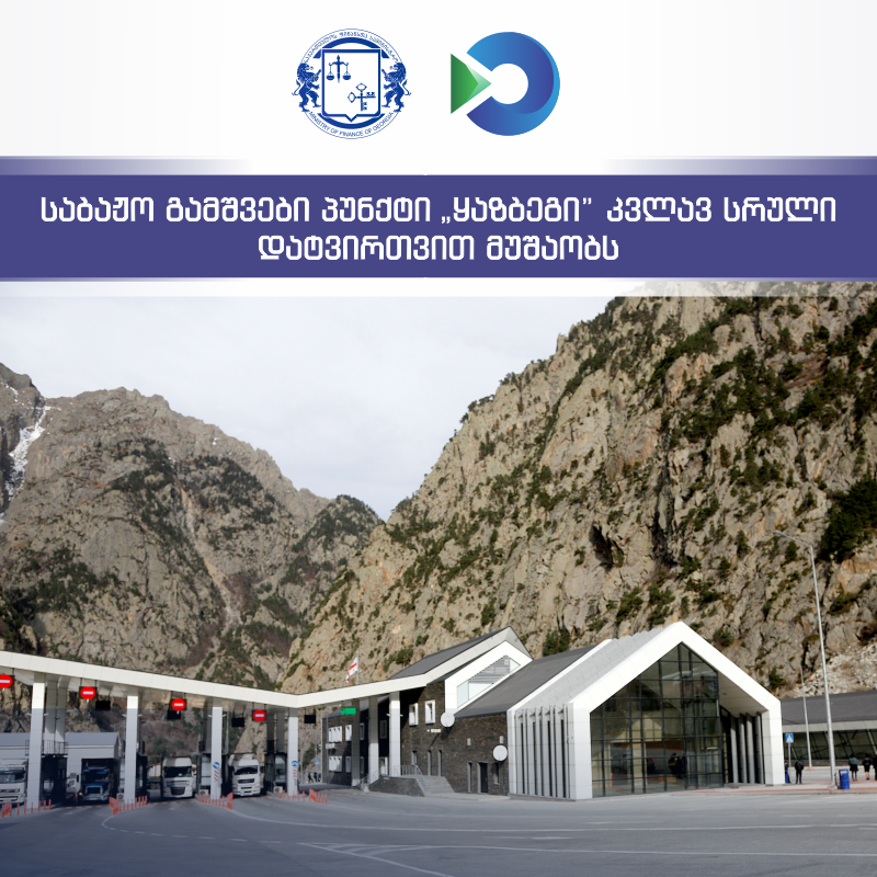 ფინანსთა სამინისტროს შემოსავლების სამსახური გაცნობებთ, რომ საბაჟო გამშვები პუნქტი ,,ყაზბეგი“ 24 საათიან რეჟიმში კვლავ სრული დატვირთვით მუშაობს.