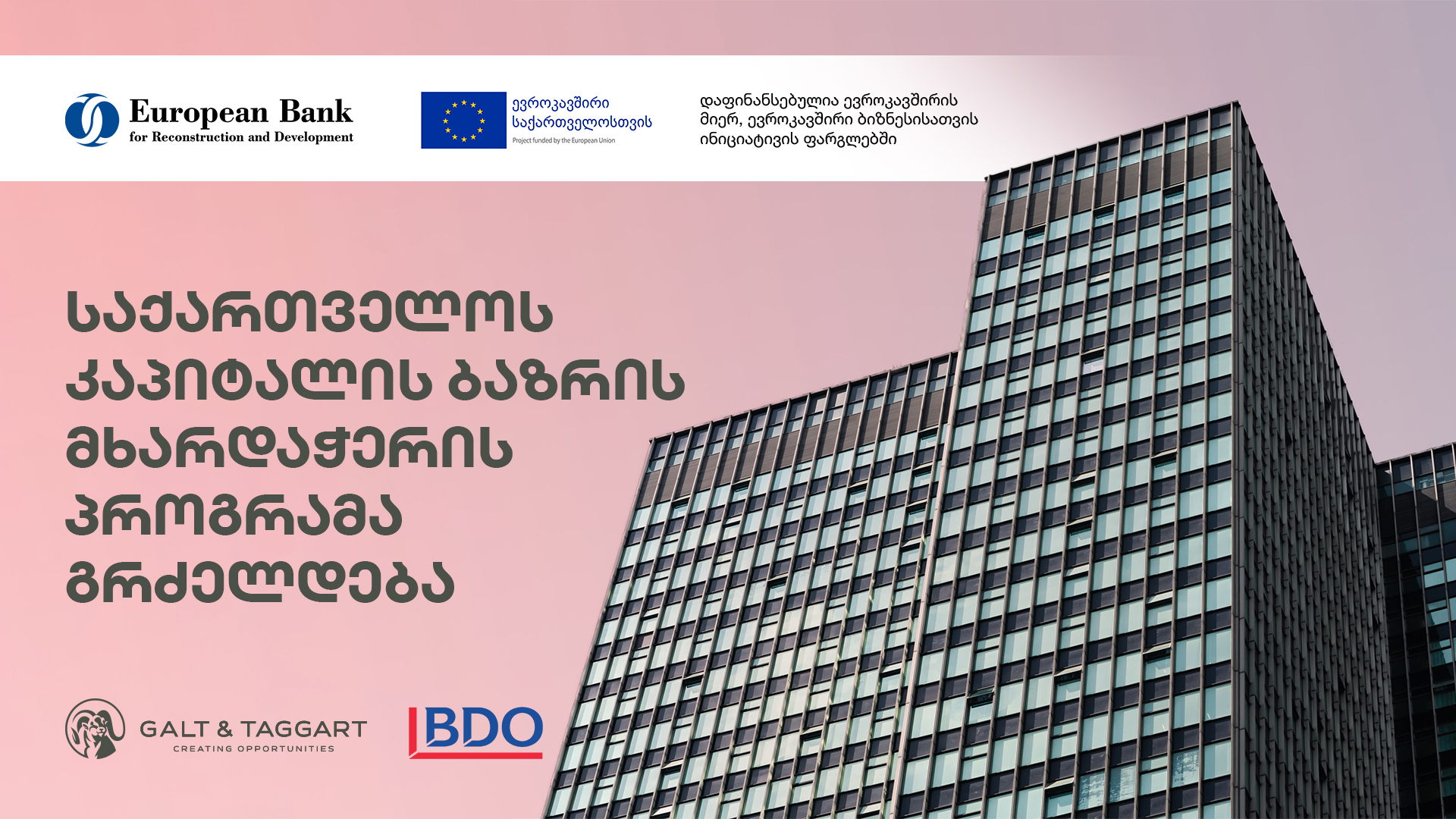 „გალტ &თაგარტი“ კაპიტალის ბაზრის განვითარების მიზნით პროექტების მხარდაჭერას განაგრძობს. ევროპის რეკონსტრუქციისა და განვითარების ბანკის (EBRD) კაპიტალის და ფინანსური ბაზრების განვითარების გუნდისჩართულობით და ევროკავშირის ფინანსური მხარდაჭერით „კაპიტალის ბაზრის მხარდაჭერის პროგრამა“ გრძელდება. პროექტის მთავარ მიზანს კი საქართველოში კაპიტალის ბაზრის განვითარების ხელშეწყობა წარმოადგენს.