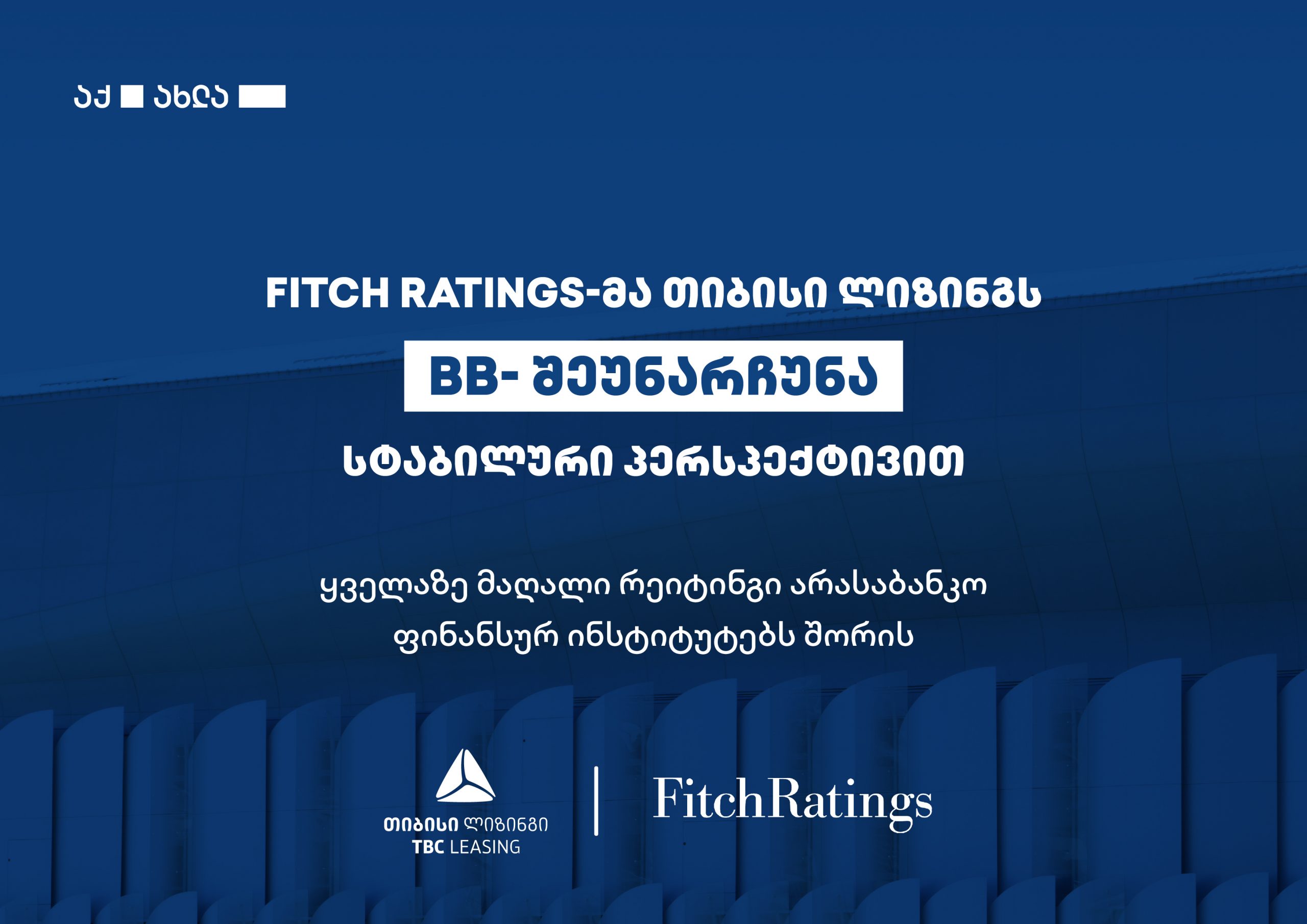 გავლენიანმა საერთაშორისო სარეიტინგო სააგენტომ – Fitch Ratingsთიბისი ლიზინგს ქართულ არასაბანკო ფინანსურ ინსტიტუტებს შორის ყველაზე მაღალი საკრედიტო რეიტინგი „BB-„ სტაბილური პერსპექტივით შეუნარჩუნა.