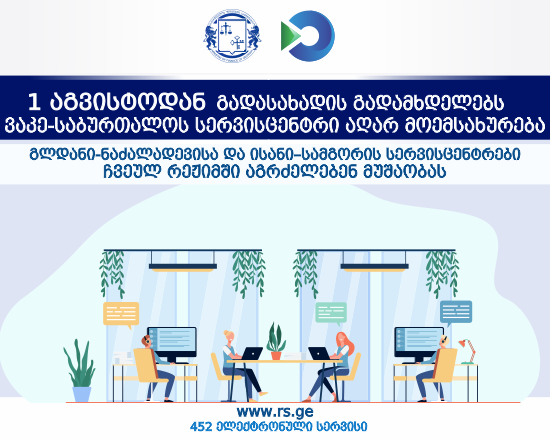 ამასთან, გადასახადის გადამხდელებს მომსახურების მისაღებად შეუძლიათ ესტუმრონ თბილისში არსებულ გლდანი-ნაძალადევისა (სარაჯიშვილის ქუჩა №1) და ისანი-სამგორის (გულუას ქუჩა № 4) სერვისცენტრებს.
