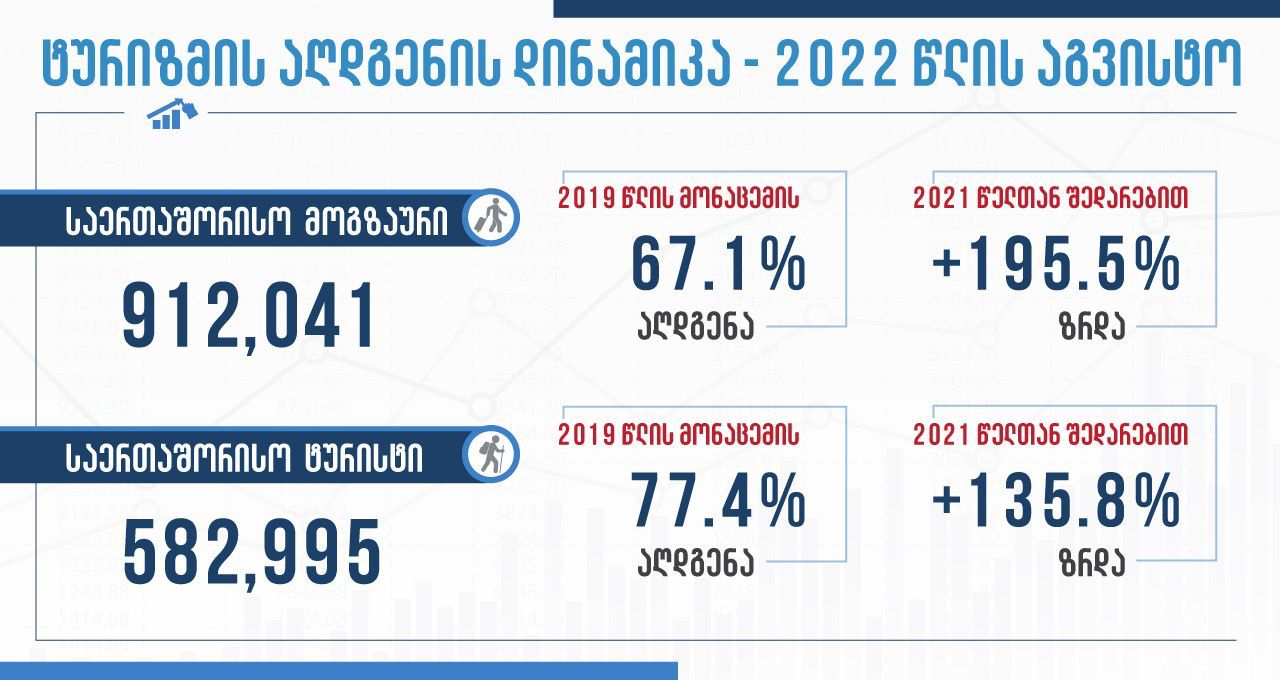 მნიშვნელოვნად გაიზარდა ტურისტული ვიზიტების აღდგენის დინამიკა. 2022 წლის აგვისტოში საქართველოში 582,995 საერთაშორისო ტურისტული ვიზიტი შედგა, ზრდა 2021 წლის ანალოგიურ პერიოდთან შედარებით +135.8%-ს შეადგენს. 2019 წლის ანალოგიურ პერიოდთან შედარებით საერთაშორისო ტურისტული ვიზიტების აღდგენის მაჩვენებელი 77.4 %-ს შეადგენს.