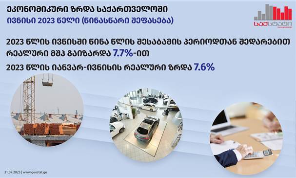 წინასწარი შეფასებით, 2023 წლის ივნისში, წინა წლის შესაბამის პერიოდთან შედარებით, რეალური მთლიანი შიდა პროდუქტის (მშპ) ზრდამ 7.7 პროცენტი შეადგინა, ხოლო 2023 წლის პირველი ექვსი თვის საშუალო მაჩვენებელი 7.6 პროცენტით განისაზღვრა.